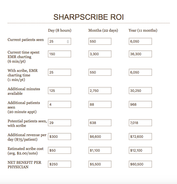 We estimate a busy physician will increase their annual net profit (after cost of scribe – estimated $1,100/month) by roughly $60,000.  More importantly, regain your lifestyle by not have to document at home in the evenings!